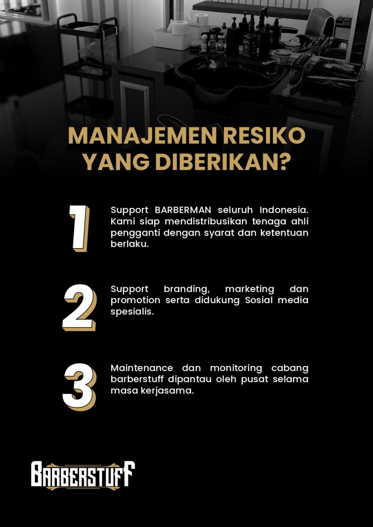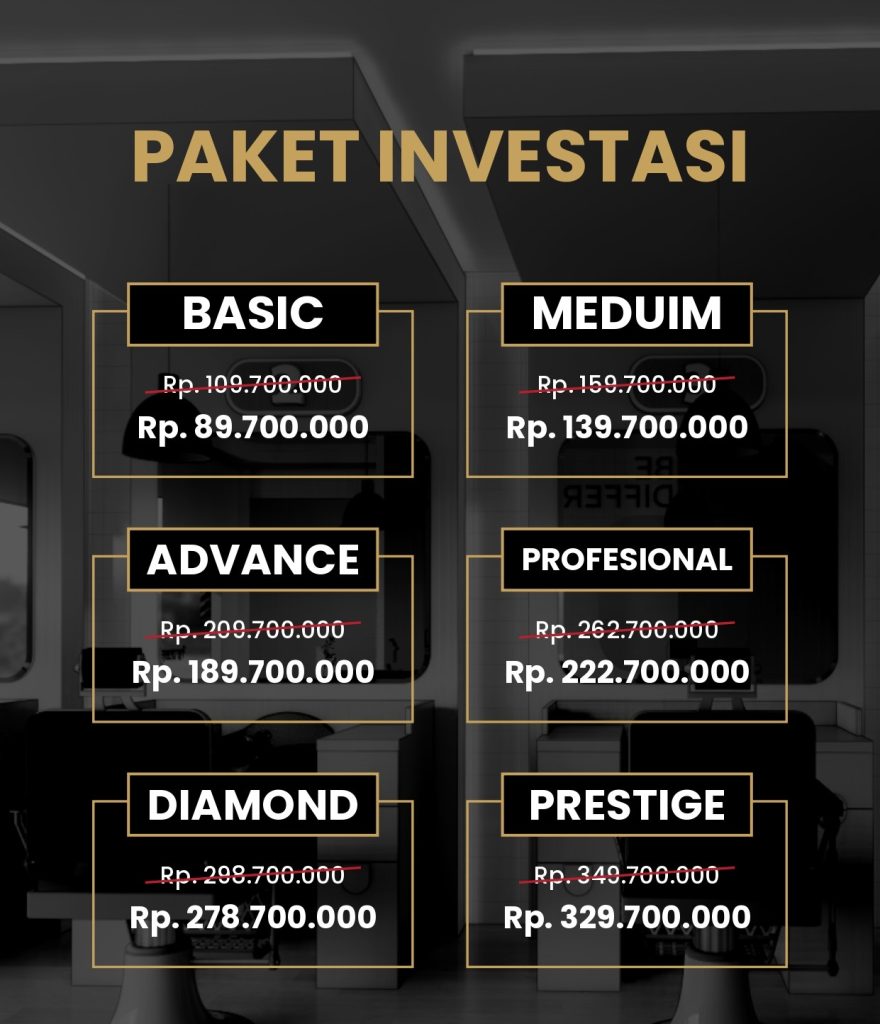 BISNIS KEMITRAAN BARBERSHOP KONTAK KAMI Facebook Instagram Youtube Bisnis Barbershop Terbaik Menjadi usaha yang sangat menguntungkan bagi kedua belah pihak. Kenapa usaha barbershop menjanjikan? Simak Penjelasannya : Kebutuhan UtamaPotong rambut termasuk kategori kebutuhan pokok utama manusia yang selalu dibutuhkan selain makan dan minum. Dan yang paling penting, bisnis kemitraan potong rambut bukan merupakan bisnis musiman. PAKET BASIC PAKET MEDIUM PAKET ADVANCE PAKET PROFESIONAL PAKET DIAMOND PAKET PRESTIGE SUKSESMU BERAWAL DARI SINI JOIN MITRA SEKARANG
